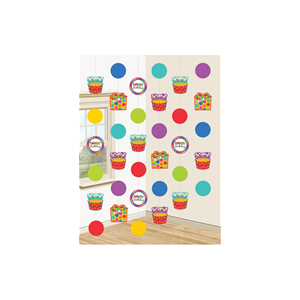 Emb. com um centro de mesa em cartão com imagêm de bolo de aniversario tem 29cm na base por 33cm de altura .Dispõe de uma franja em rosa magenta como base, ideal para a decoração da sua mesa de festa.