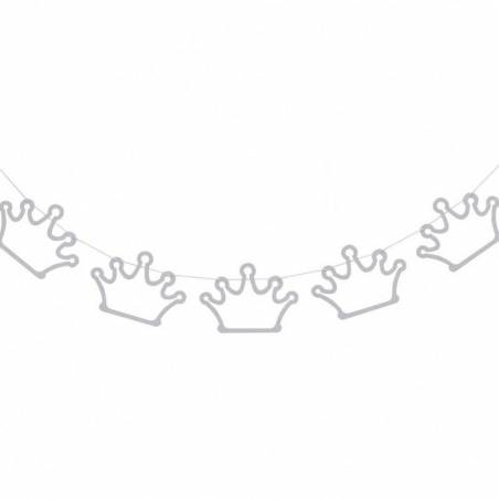 Grinalda decorativa com 2 mt de comprimento, ao longo do fio encontra figuras recortadas em cartolina/cartão na forma de coroas (16 x 12cm) na cor prata com glitter.
