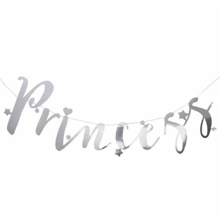 Grinalda decorativa com 1.5mt de comprimento, ao longo do fio encontra a palavra Princess recortada em cartolina/cartão na cor prata metalizado, cada letra tem cerca de 15cm de altura. Nota: impressão de prata metalizado em apenas um dos lados...