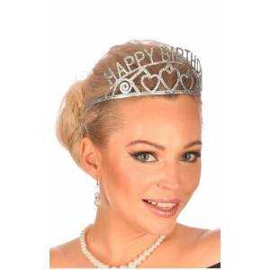 Tiara na cor prata, com inscrição (Happy Birthday) rosa fuchia. Ideal para identificar a aniversariante.