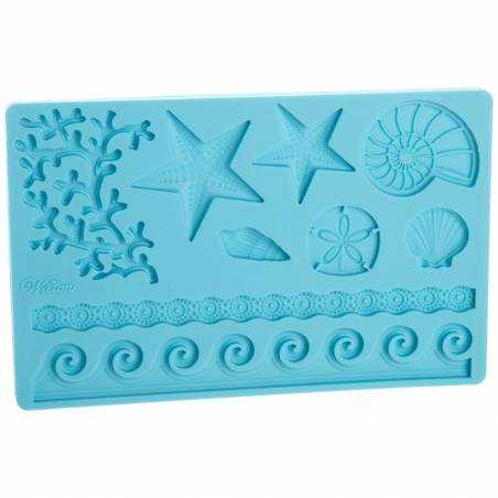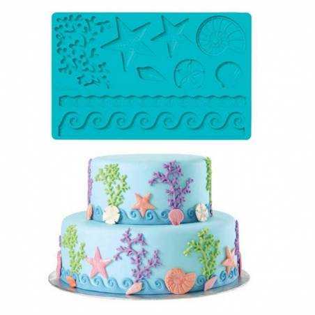 Molde em silicone com motivos do Mar, tem cerca de 20x14cm. Ideal para trabalhar Pasta de Açúcar, não pode ir ao forno. Produto de qualidade marca Wilton.