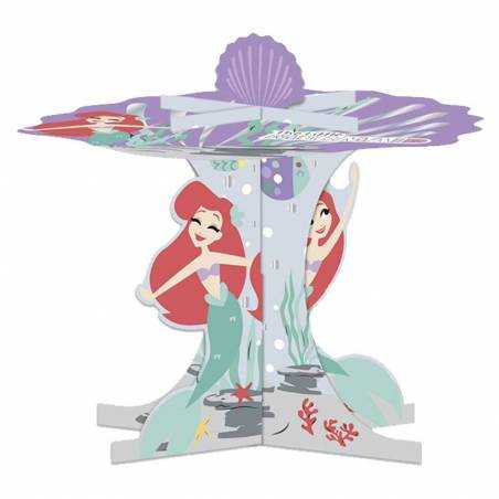 Emb. com um expositor de cupcake tem cerca de 25cm de altura com 1 base superior com 27cm de diâmetro, tudo em cartão com impressão do tema Pequena Sereia (Ariel).
