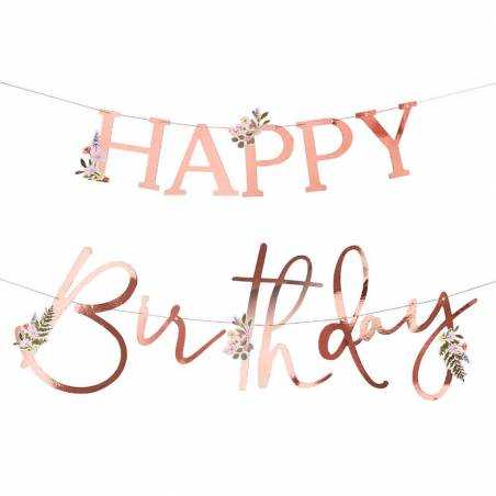 Faixa decorativa com 1.5mt de comprimento, ao longo do fio encontra a palavra Happy Birthday recortada em cartolina/cartão na cor dourada, cada letra tem cerca de 15cm de altura. Nota: impressão de dourado metalizado em apenas um dos lados...