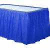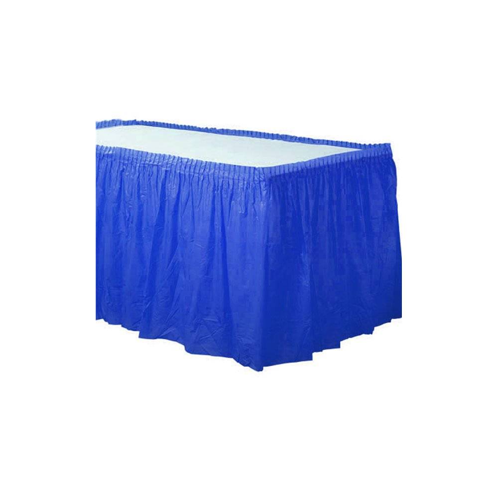 Emb. com um saiote azul marinho de plástico com 73cm de altura por 4.26m de comprimento, este saiote pode ser usado em (casamentos, aniversários , baptizados....) é adaptavel a mesas redondas ou retangulares até mesmo para mesas ovais.Dispõe de uma faixa autoculante para uma mais facil aplicação. A cor apresentada na imagem pode divergir do produto, devido a qualidade de imagem.