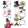 Kit fotográfico inclui 12 peças em papel; chapéu, lábios,laço, mascara, relógio, corneta, inclui 3 figuras que pode personalizar. Ideal para tirar fotos em na noite de Passagem de Ano.