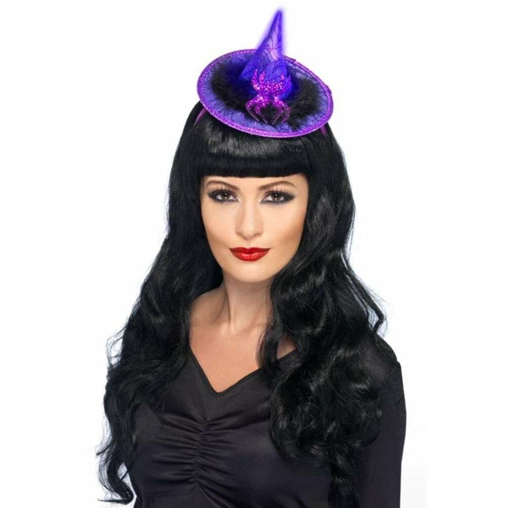 Emb. com um mini chapéu (bandelete) de bruxa roxo com luz no interior.