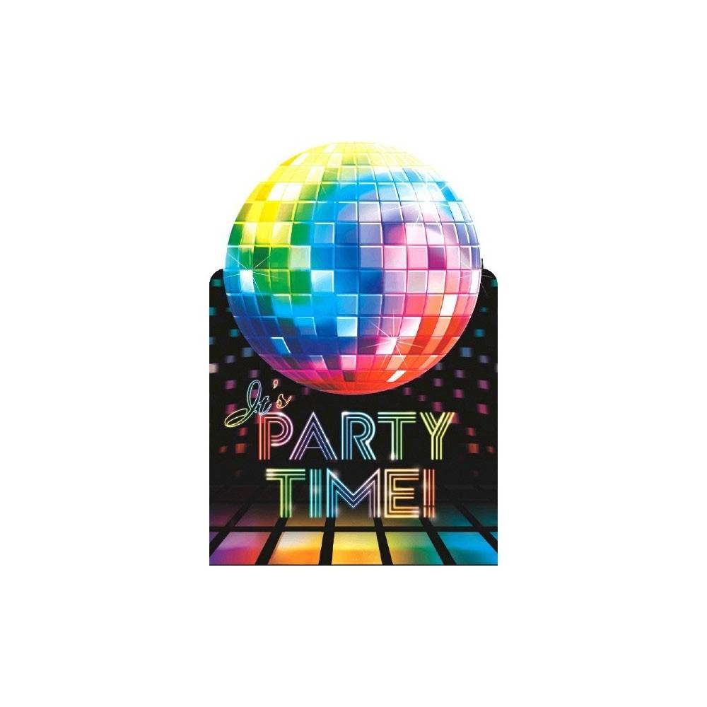 Emb. com 8 convites (texto em Inglês: date. for, time...) e seus respectivos envelopes + 8 autocolantes na forma de bola de espelhos para selar o envelope + 8 selos (save the date).