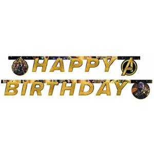 Emb. com uma grinalda de bandeiras triangulares (17cm lag. x 25cm alt.) com impressão do tema Avengers Infinity War. Tem cerca de 2.3m de comprimento, todas as bandeiras são unidas por um cordão em plástico.