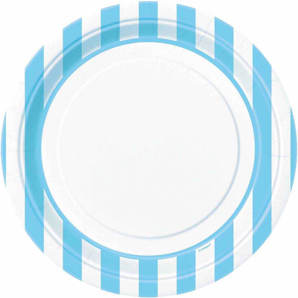 Emb. com 8 pratos de papel com 22cm de diâmetro na cor azul pastel com riscas brancas.