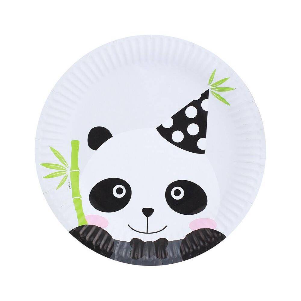 Emb. com 8 pratos em papel na forma de cara de panda com 20cm de diametro.