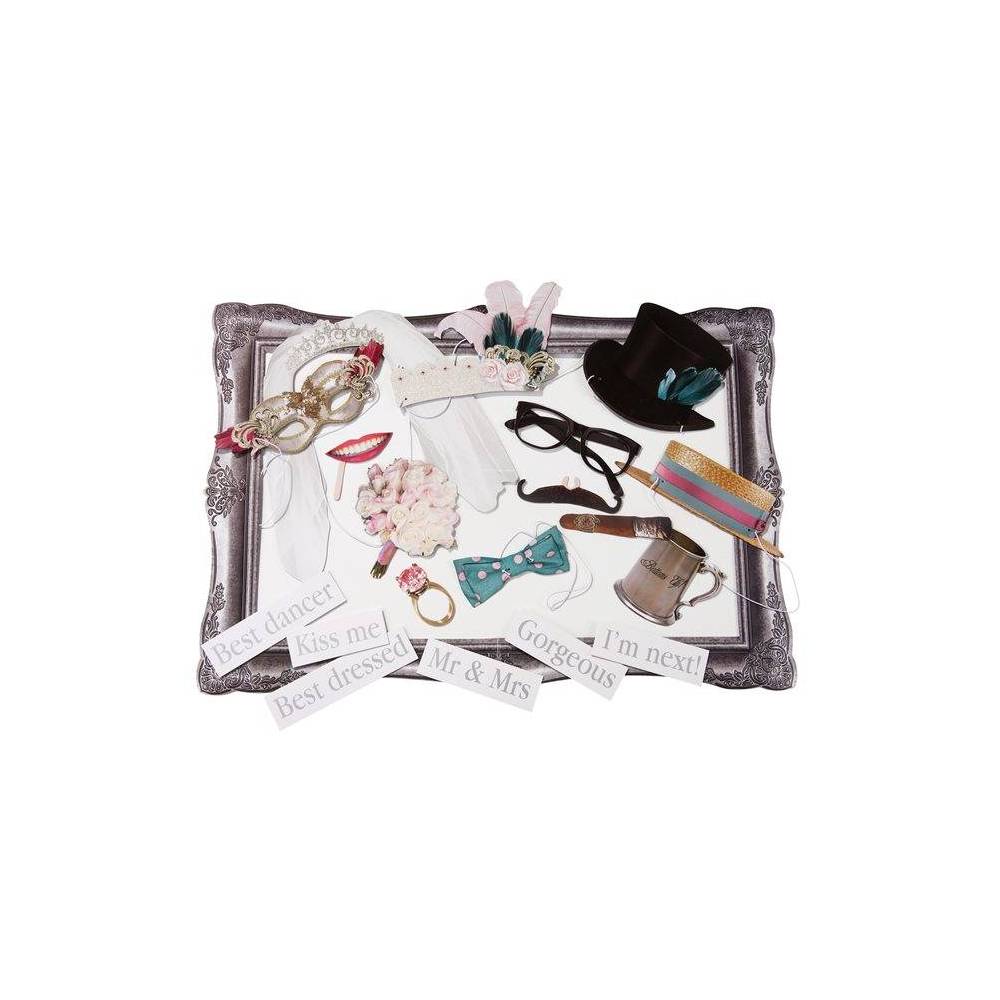 Kit fotográfico inclui 20 peças: - óculos, chapéus, véu, aliança, boquê, bigode, placas com mensagens( kiss me , smile, best dancer...) moldura com 60 x 40cm. Ideal para as fotos do seu dia de casamento.
