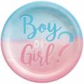 Emb. com uma toalha em plástico com 1.37m x 2.59m, com impressão Girl or Boy?, do tema Chá revelação. Nota:impressão apenas nas laterais sendo o interior branco.