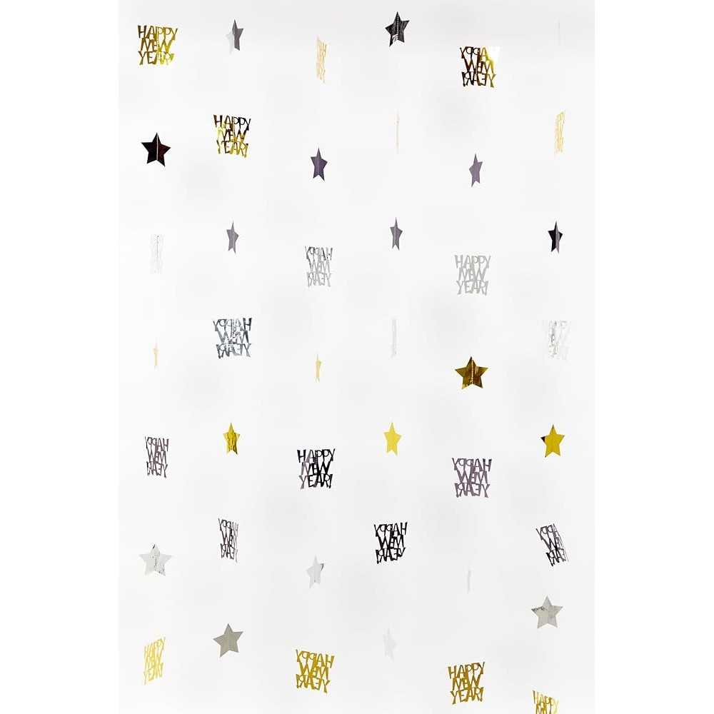 Emb. com 8 fios decorativos individuais, cada fio têm cerca de 1.80m, ao logo dos 1.80m estão aplicados formas redondas (prata, dourato e preto) de varios tamanhos, recortadas em cartolina com a palavra/imagens( Happy New Year, copos de Champanhe, cartolas, relógios), todos juntos estes fios podem fazer uma cortina para a entrada do seu espaço.