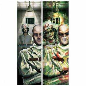Cartaz lenticular com 94cm de altura por 29.2cm de largura, do tema cemitério. A imagem apresentada representa as 2 imagens que observa apenas em um cartaz, pois imagem altera conforme a sua posição perante ela.