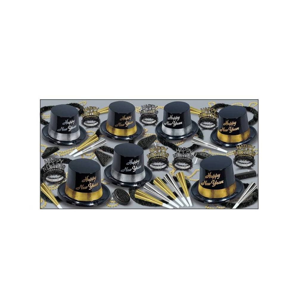 Kit passagem de ano 50 pessoas na cor prata/preto, dourado/preto que inclui; - 25 cartolas em plástico na cor preta com impressão Happy New Year em prata ou dourado + fita prata ou dourada. - 25 tiaras em preto com palavra Happy New Year recortada em prata ou dourado. - 30 cornetas na cor dourada / prata - 25 colares pretos - 20 relógios (barulho) - 25 colares pérolas douradas.