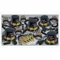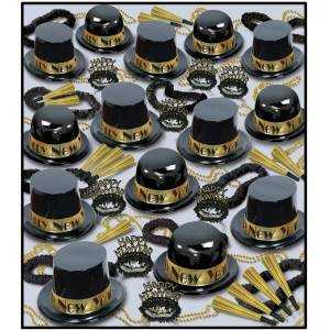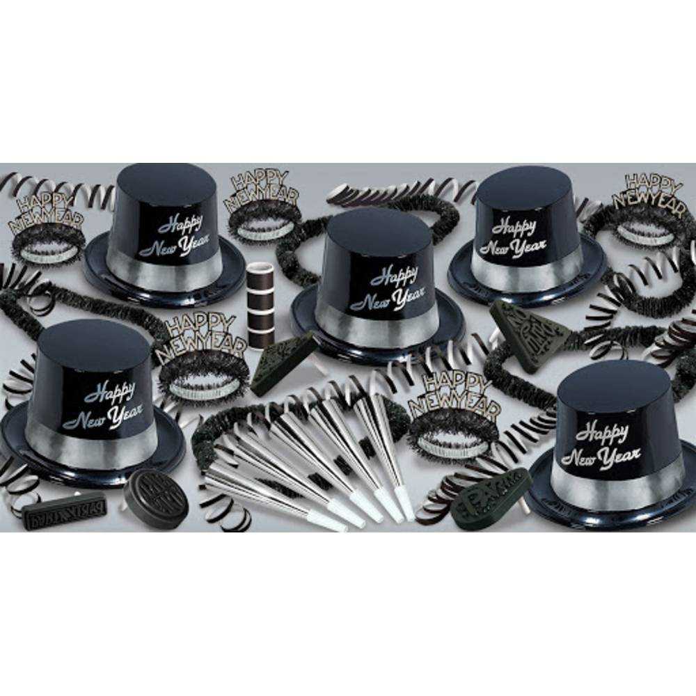 Kit passagem de ano 50 pessoas na cor prata/preto que inclui; - 25 cartolas em plástico na cor preta com impressão Happy New Year em prata + fita prata - 25 tiaras em preto com palavra Happy New Year recortada em prata - 30 cornetas prata - 25 colares pretos - 20 relógios (barulho) - 25 colares perola.
