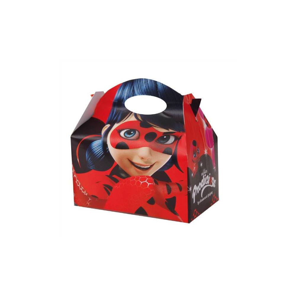 1 caixinha (15cm x 10cm x 14cm) montável em cartão, do tema LadyBug. Ideal para colocar as prendas de festa.