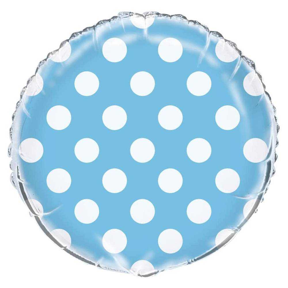 Emb. com um balão folha de alumínio com 45cm de diâmetro na cor azul pastel com bolinhas brancas, do tema Bolinhas. Nota: Balão vendido vazio para ser cheio com hélio.