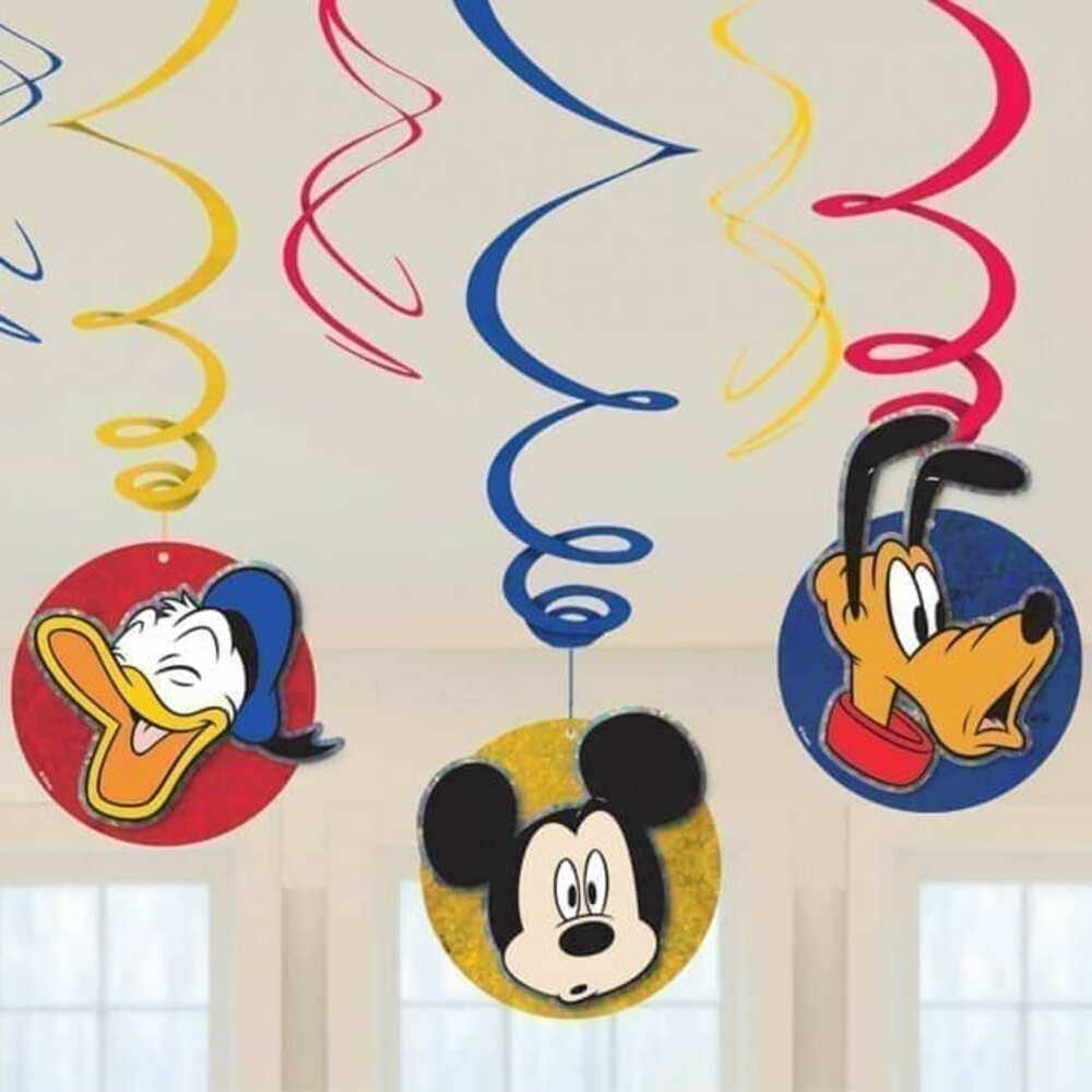 Emb. com 6 espirais decorativas do tema Mickey: - 3 com cerca de 60cm de altura com imagens do tema na extremidade, - 3 simples em amarelo vermelho e azul com 45cm de comprimento. Nota; as imagens apresentadas podem divergir ligeiramente do produto.