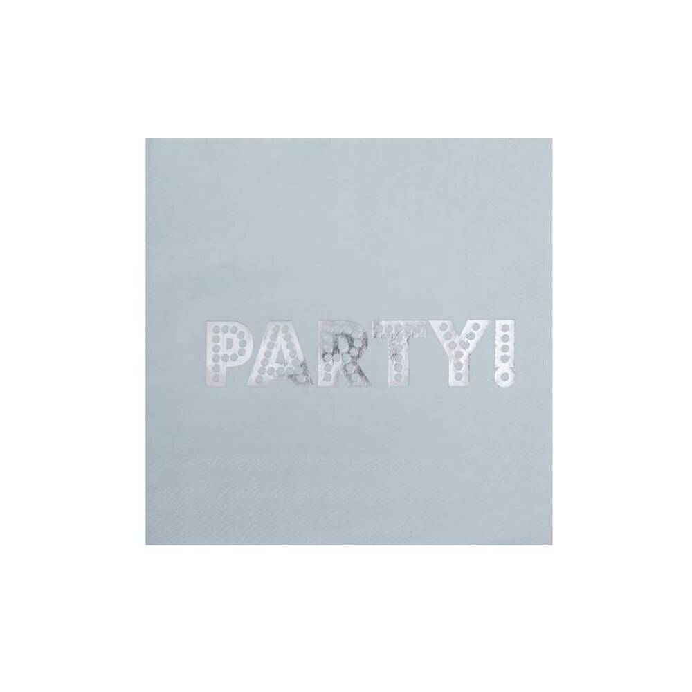Emb. com 20 guardanapos em papel com 33cm x 33cm, do tema Party Azul Pastel. Nota: impressão Party em papel prata metalizado.