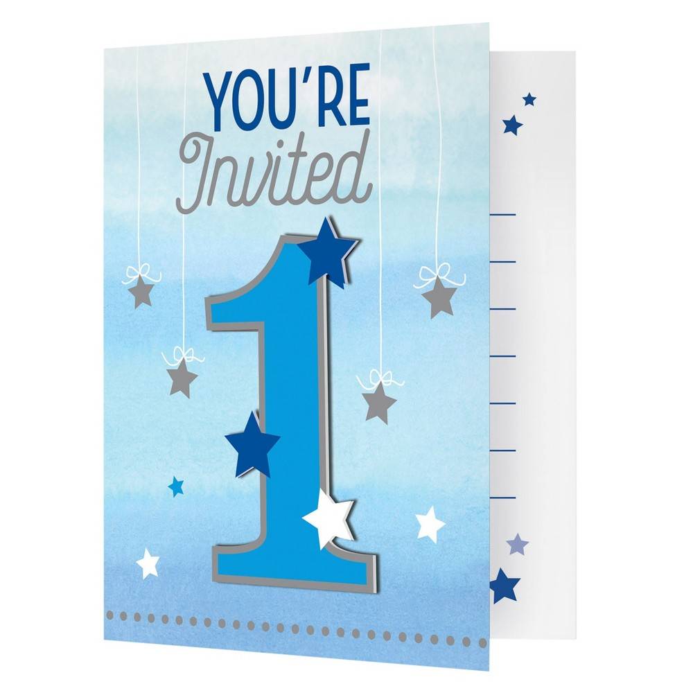 Emb. com 8 convites + respectivos envelopes do tema Pequena Estrela Menino. Nota: inclui nº 1 recortado para aplicar na frente do convite em relevo. Não dispõem de texto.