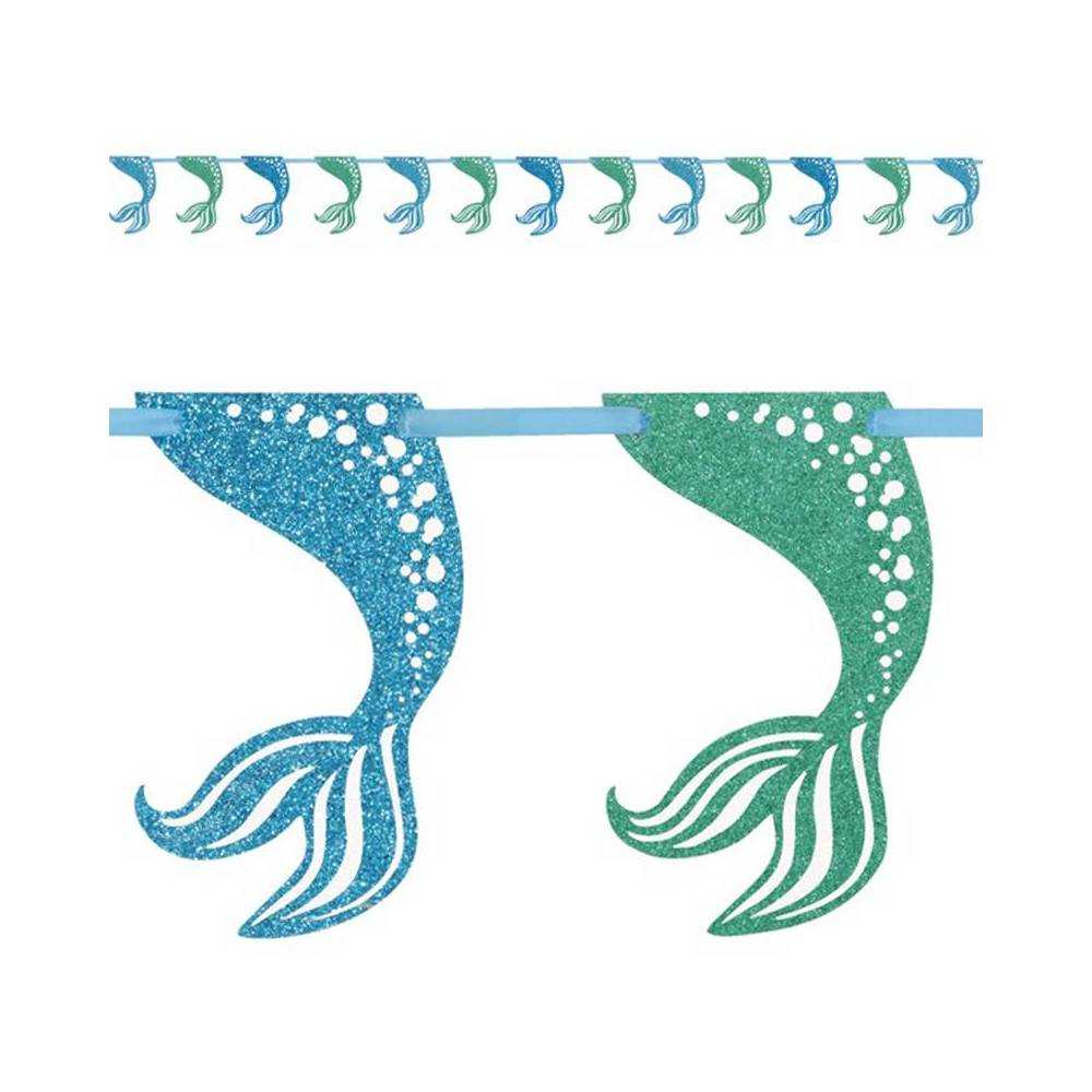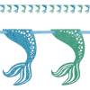Grinalda decorativa com 2.74 mt de comprimento, ao longo do fio encontra figuras recortadas em cartolina/cartão na forma de caudas de Sereia com 19 x 10cm na cor azul/verde com glitter em apenas um dos lados..