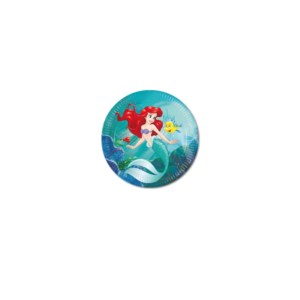 Emb. com 8 pratos em papel de 23cm de diâmetro, do tema Pequena Sereia. Nota: com trabalhado em prata iridiscente.
