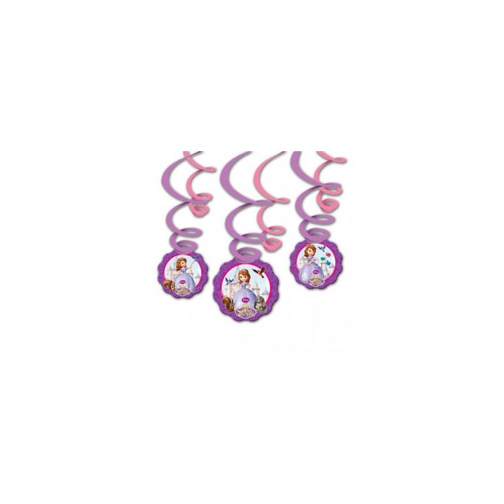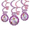 Emb. com 6 espirais de 61cm de altura na cor rosa e lilás, 3 espirais com imagens da Princesa Sofia nas pontas com 14cm de diâmetro .Ideal como decoração de teto.