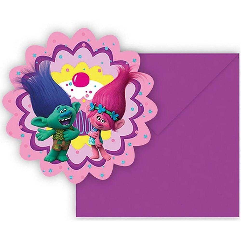 Emb. com 6 convites recortados com 11cm de diâmetro + respectivos envelopes, do tema Trolls. Nota: não dispõem de texto apenas símbolo (casa, relógio, telefone).