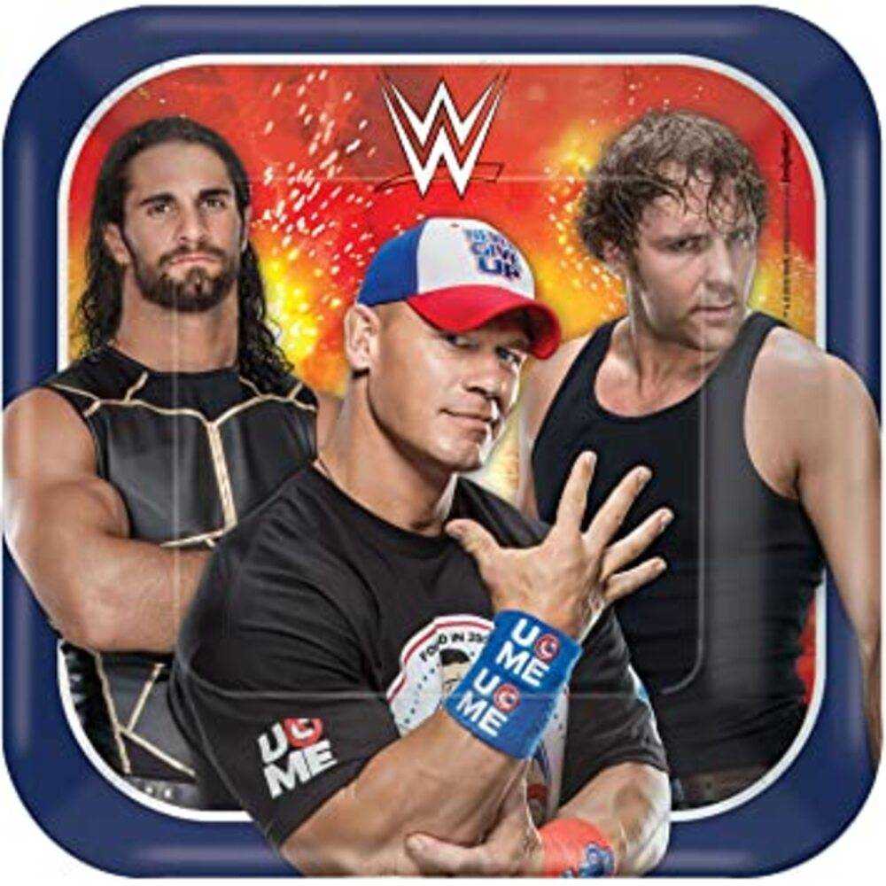 Emb. com 8 pratos quadrangulares em papel com 17,8 x17,8cm, do tema WWE.