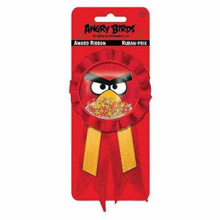 Crachá trabalhados na cor vermelho e amarelo com impressão do tema Angry Birds, o interior do crachá contem confettis em forma de estrelas nas cores prata, vermelho e dourado.