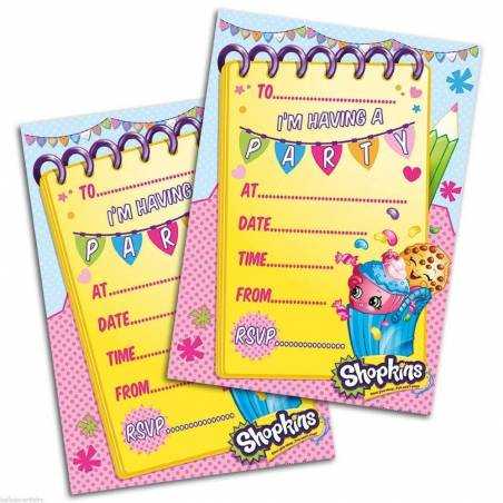 Embalagem com 20 convites e respetivos envelopes, do tema Shopkins.
