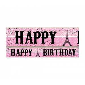 Embalagem com uma faixa decorativa em papel com impressão de Happy Birthday com 1mt de comprimento do tema Paris.