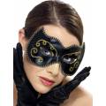 Embalagem com uma mascara em prata ou dourado, elástico incluído.