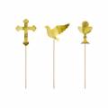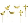 Embalagem com 6 palitos decorativos de cupcake/aperitivos com 2 pombas, 2 cruzes e 2 assas em dourado metalizado.